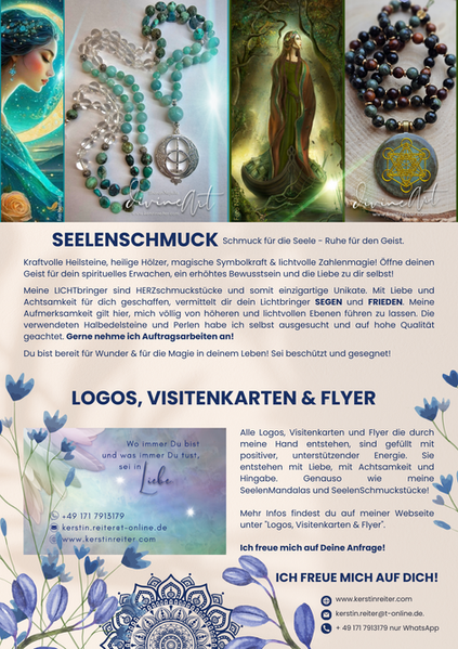 Wenn sich dies für Dich stimmig anhört und Du auf der Suche nach Deinem ganz individuellen Logo, Deiner eigenen Visitenkarte oder einem speziell für Dich erstellten Flyer bist, schreibe mir bitte direkt an meine E-Mail-Adresse: divineArt@t-online.de, über WhatsApp oder Telegram. Meine Kontaktdaten findest Du HIER.